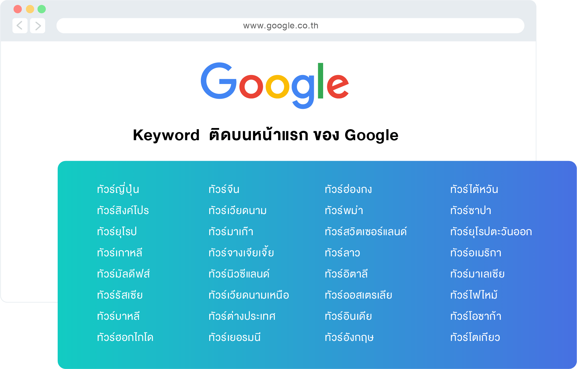 โครงสร้างเว็บไซต์ของ WOW ออกแบบให้ตรงตามหลัก SEO เพื่อให้ติดอันดับแรกๆ ในระบบค้นหา Google ยืนยันด้วยความสำเร็จจริงของลูกค้า มากที่สุดในธุรกิจ Tour Outbound